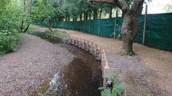 Major works have been carried out on path 71, The Avon Valley Path, between Hurst Road and Snails Lane. Many will remember tripping over the tree routes where the bank was being undercut by the brook - as below.