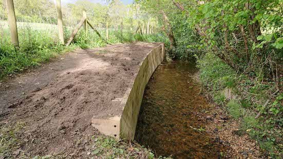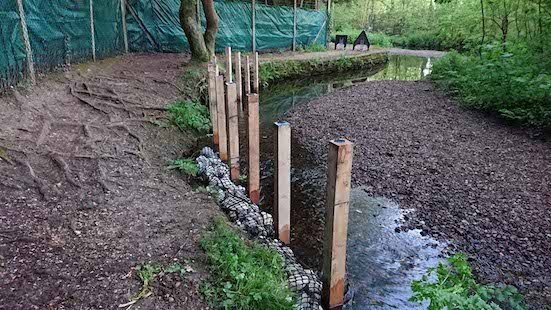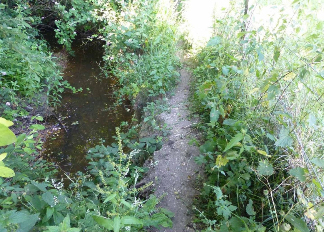 gate has been installed (as above). The stream bank at the western end had been eroded for several years (see left). That has now been reinforced with caged stone and timber facing to make this length a safer route.